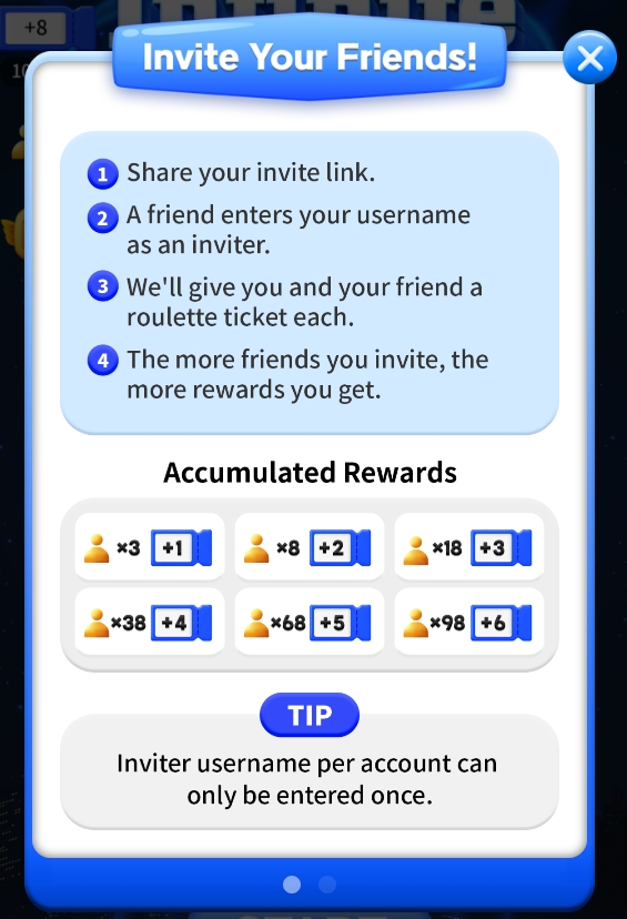 referral : 1 for 1 invite (add 1 for both invitees and invitees) Additional tickets based on cumulative invitations